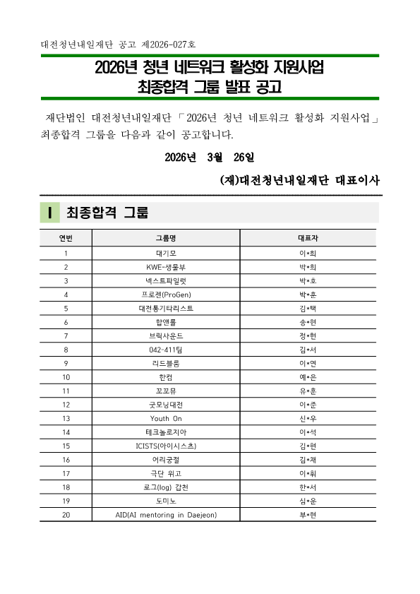 재단법인 대전청년내일재단 ⌜2026년 청년 네트워크 활성화 지원사업⌟ 최종합격 그룹을 다음과 같이 공고합니다.