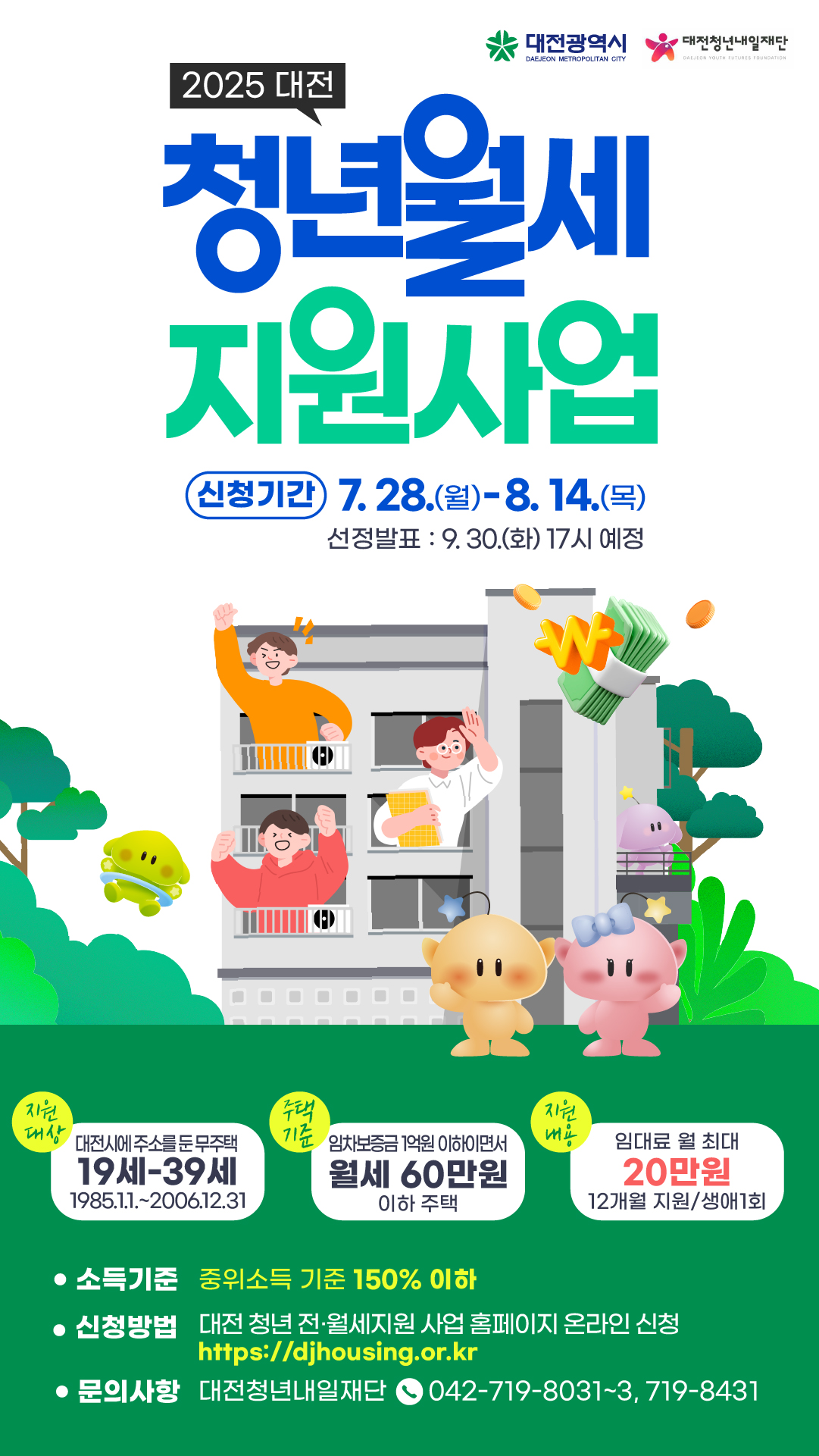 - 사업대상 : 신청일 기준 대전광역시에 주민등록이 되어있고 매달 월세를 납부하는 19세 ~ 39세 무주택 청년 가구