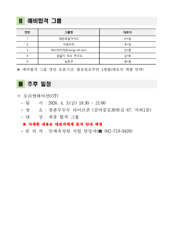 재단법인 대전청년내일재단 ⌜2026년 청년 네트워크 활성화 지원사업⌟ 최종합격 그룹을 다음과 같이 공고합니다.